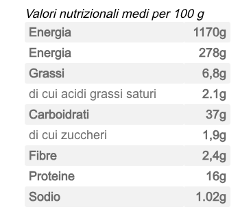Ingredienti: Semola di grano duro (glutine) 27%, seitan 30% (glutine), aromi naturali, sale, spezie. Origine: Italia