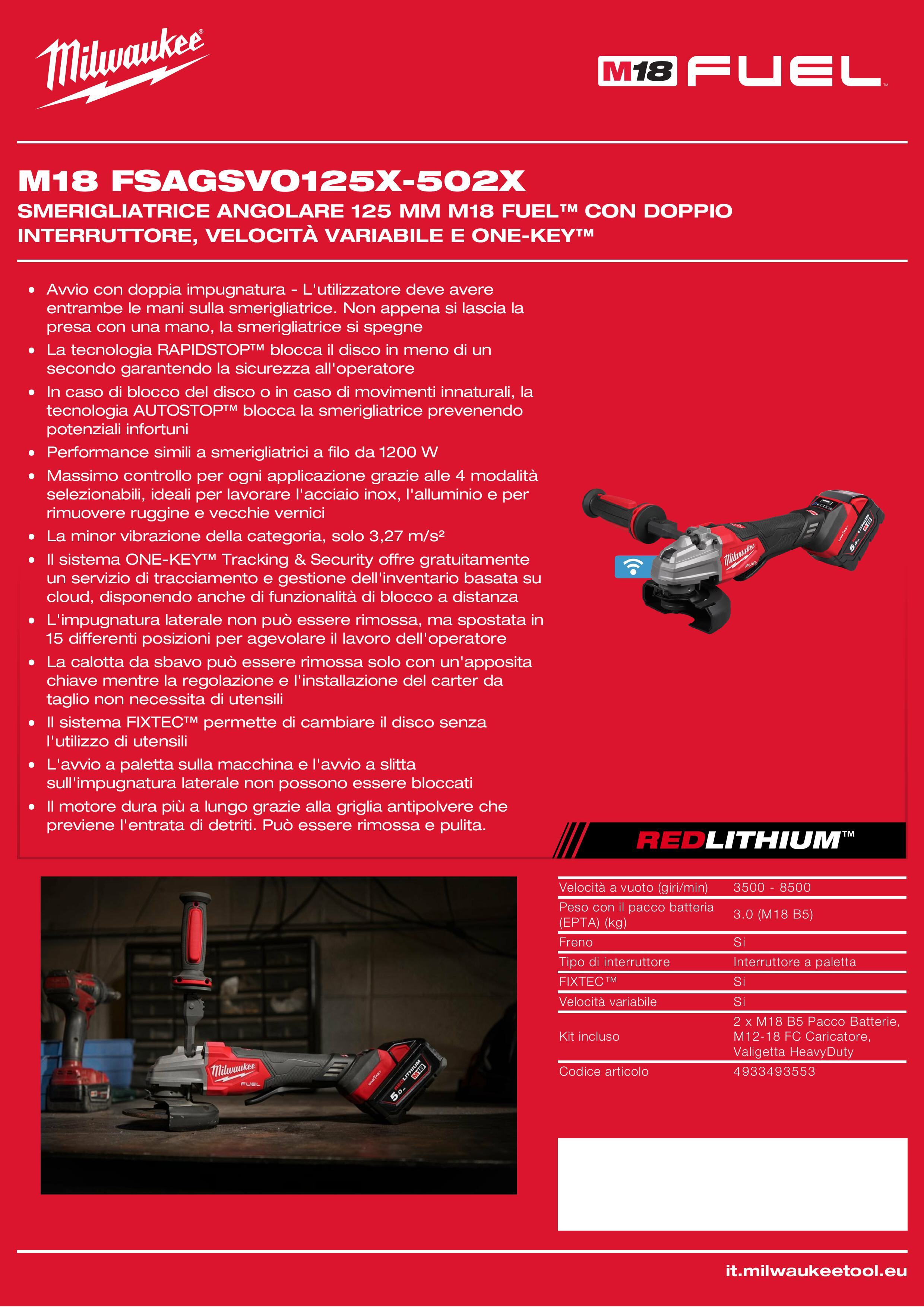 In grado di fornire prestazioni pari a 1.200 W Sistema RAPIDSTOP™ in grado di frenare il disco in meno di 2 secondi, per maggiore sicurezza Dimensioni della testa ridotte e alloggiamento della batteria ottimizzato: massima maneggevolezza Impugnatura laterale antivibrazioni AVS Sistema FIXTEC™ per sostituzione del disco senza attrezzi Impugnatura ergonomica Griglie antipolvere rimovibili, per proteggere il motore dalle polveri abrasive Calotta a sgancio rapido: massima capacità di taglio e rapida regolazione Protezione contro il riavvio accidentale La tecnologia FUEL™ ridefinisce gli elettroutensili a batteria. Il motore brushless, l'elettronica REDLINK PLUS™ e il pacco batterie REDLITHIUM™ offrono prestazioni e durata superiori Funziona con tutte le batterie M18TmMILWAUKEE®